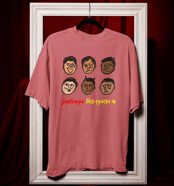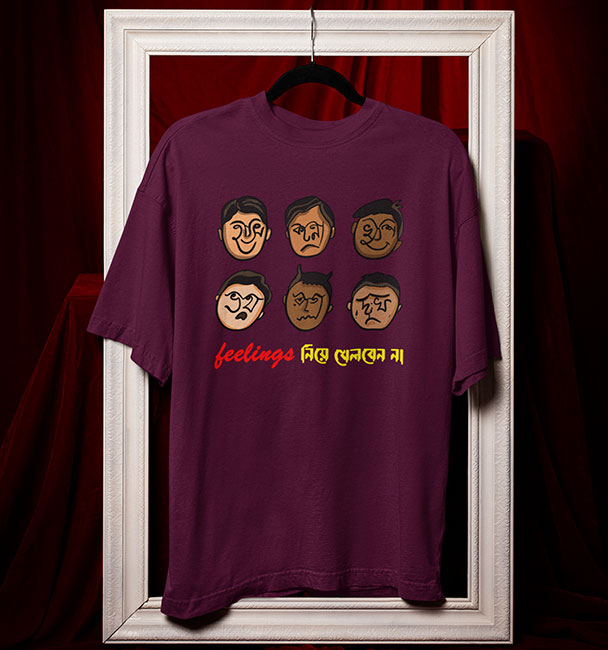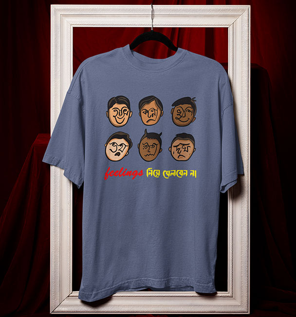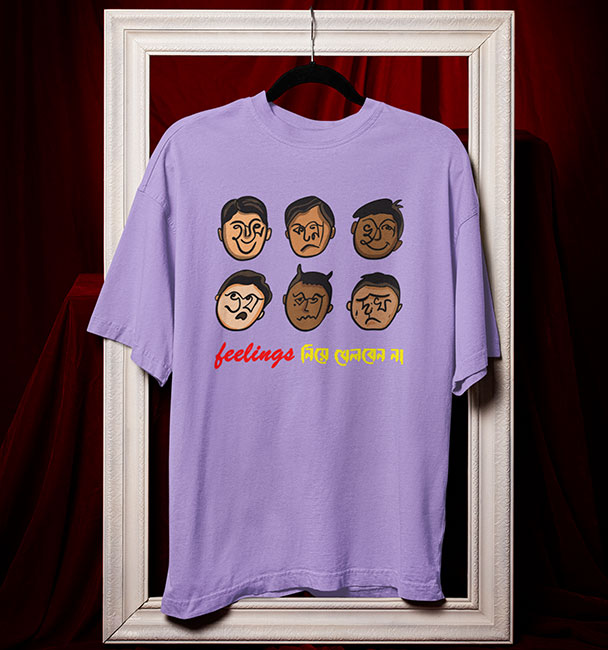 ‘Feelings নিয়ে খেলবেন না!’ ছয় রকম মুখভঙ্গি, হাসি, কান্না, ভয়, রাগ, দুঃখ আর খুশি সব একসঙ্গে পাবেন এই Oversized টি-শার্টে! যাঁদের 5G গতিতে মুড সুইচ হয় বা একটু বেশি সেনসিটিভ, তাঁদের জন্য পারফেক্ট। #BanglaQuotes